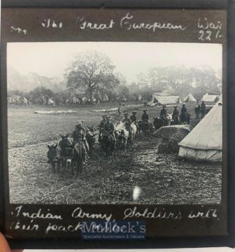India & Punjab – WWI Indian Soldiers antique glass slide negative of Sikh Indian soldiers of the British Army with their Mules, at their camp in France, during the First World War c1915