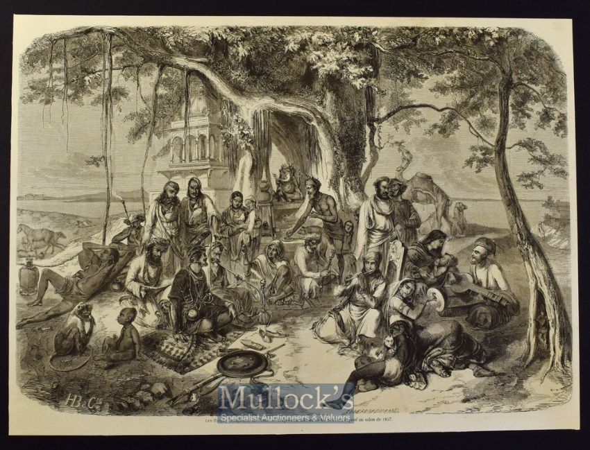 India - The Thugs (Stranglers) of India original engraving 1857 after a painting by August Theodore Scoeft who travelled over India 1838-1842 and executed many paintings. This image depicts a halt at the Shrine of Ganesh with a Thug about to strangle a guest seated on a carpet^ the original caption by the artist supposedly states that the two men standing behind them are nujeeb (policemen in disguise)^ the rest being Thugs. The original oil painting was sold at Christies in Oct 2009^ 34x24cm laid to card