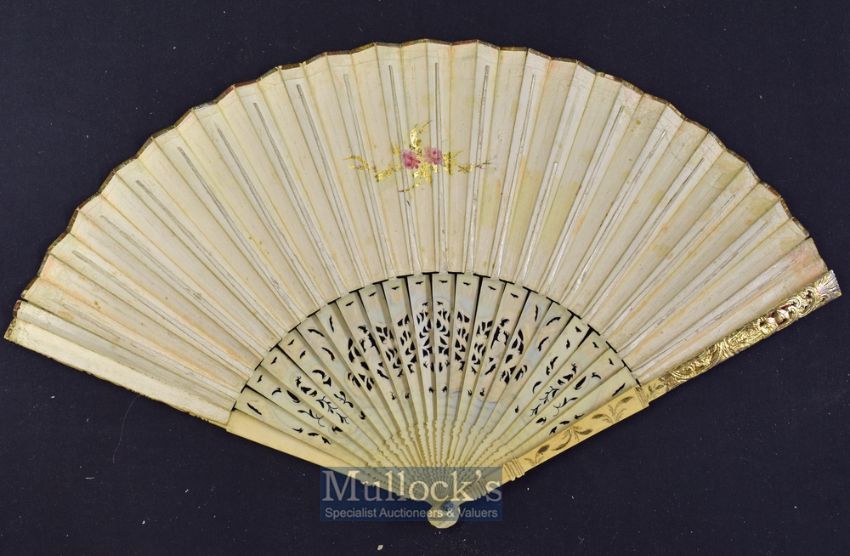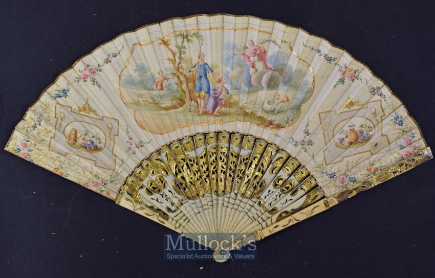 An Early Dutch Folding Fan^ c. 1780s A beautiful folding fan with bone pierced and inlaid guards with matching sticks forming a figural scene^ with paste rivet^ the paper mount painted with a large central shaped cartouche showing Allegorical Figures in an Arcadian landscape^ and two shaped rectangular cartouches either side painted with fruits and beehive^ the single leaf painted verso with flowers and gilt foliage^ guard length 28cm^ width approx. 49cm.