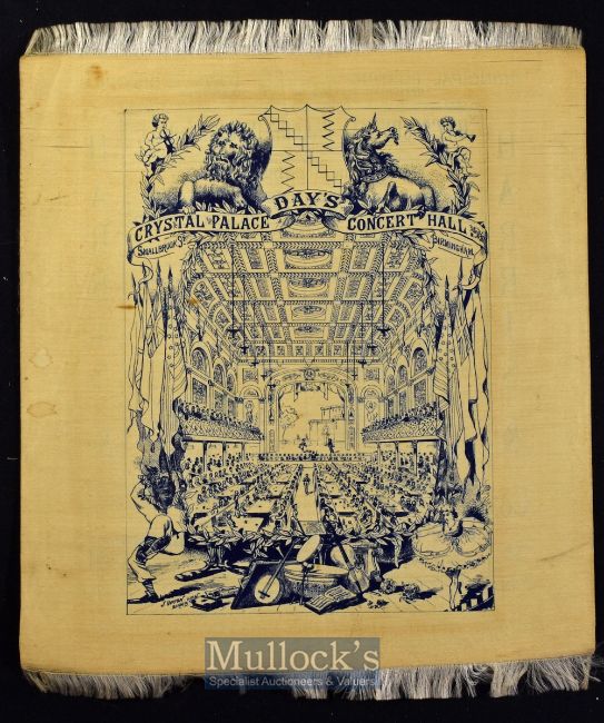 Birmingham - Day’s Crystal Palace of Varieties^ In Small brook Street Beautiful Double Sided Silk Souvenir Programme 21st December 1886 Grand special Performance being the 24th Anniversary of this Magnificent Hall. Large bill of 31 different acts Including Vesta Tilly and Harry Randall then great stars of the Music Hall Obverse; Detailing with listing the Acts etc. The reverse has a most magnificent view of the interior of this Concert Hall. Ornately printed in blue^ size 9½” x 11½”. (Days Crystal Palace Concert Hall. opened on 18th October 1862. It was sold to Edward Moss of the Moss Empires Ltd^ chain in September 1893^ and was partially altered to build his new Empire Palace Theatre. The Empire Palace of Varieties opened on 7th May 1894 with Gus Ellen topping the bill. All the top names in music hall and variety played at the Birmingham Empire^ including Marie Lloyd and Harry Lauder. The end came abruptly in October 1940^ when the Empire Theatre was hit by German bombs^ and was left in ruins.)
