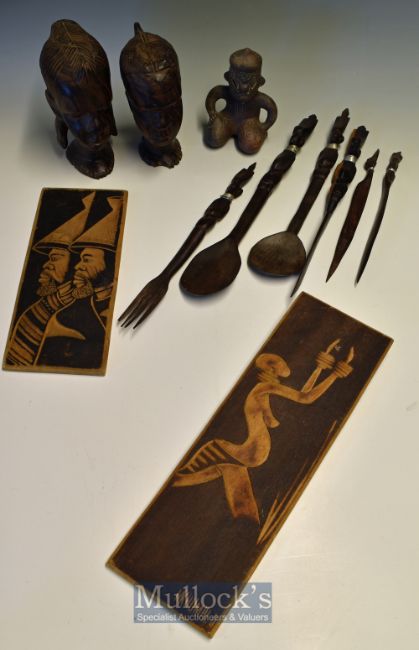 Collection of Wooden African Tourist Ware - To consist of 2 heads^ 3 figures 35cm high together with 6 various spoons^ forks (Box)