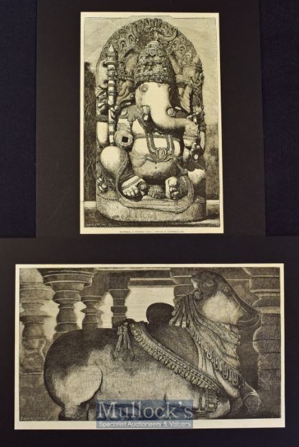 India - Ganesa a Hindoo Idol and Nandi the Sacred Bull of Siva original engravings 1858 from photographs taken by Mr Oakley at the Temple of Hallibeed^ N.W. Mysore 21x13cm and 24x15cm laid to card (2)