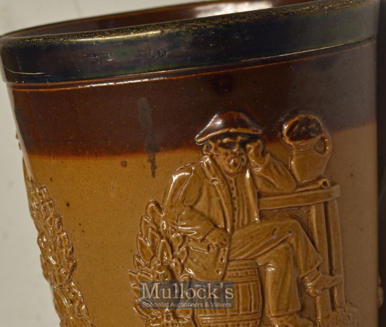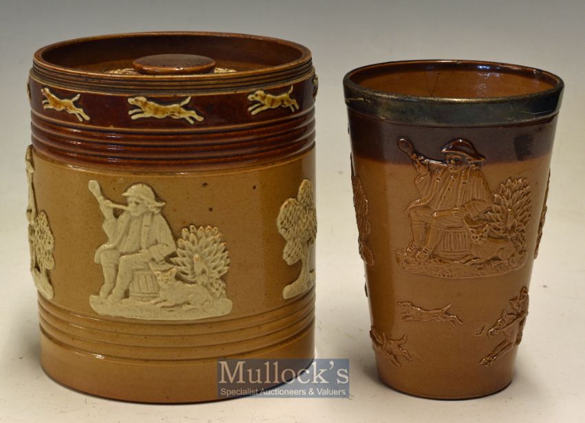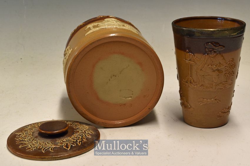 Royal Doulton – Doulton Lambeth Stoneware Pottery Tobacco Jar and Beaker the tobacco jar marked 7838 and ‘ds’ to bottom^ the beaker marked ‘p’^ with faint hallmark to rim^ the beaker appears with one crack otherwise in good condition^ the tobacco jar with lid^ appears with no signs of cracks and in good condition (2)