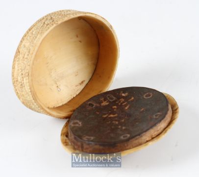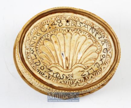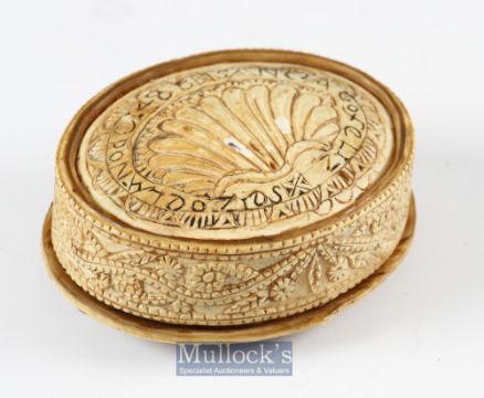 15th c Carved Bone Hinged Box Dated 1488 of oval form with overall carved decoration with repeat design to side of body with shell to base surrounded by inscription 'Santia Gofeliz Seizoelanode 1488'. The hinged lid having nailed wood and iron plate to interior with nails visible to lid top^ length 8cm.