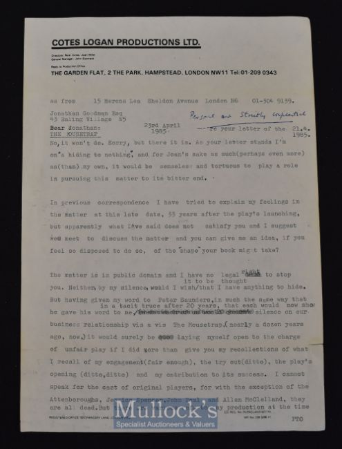 Peter Cotes – Original Director of ‘The Mousetrap’ Signed Typed Letter - inscribed ‘Personal and strictly confidential’ with annotations throughout to a Jonathan Goodman^ date 23 April 1985^ single sheet^ in A/G condition overall