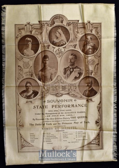 A Special Souvenir Opera Programme of the State Performance Given By The Royal Opera House^ Covent Garden in honour marriage of their Royal Highnesses the Duke of York and the Princess May of Teck. (Later King George V and Queen Mary). 1893. A beautiful silk presentation programme with Portraits of The Royal Couple^ Queen Victoria^ Prince and Princess of Wales etc. Gounod’s “Romeo et Juliette” The vocalists were Mme. Melba^ Mlle. Bauermeister^ M. Bonnard^ M. Plancon^ M. De Reszke^ etc. Attractively printed in a brown on fine silk^ size 13” × 21¼”. (In fine bright almost as new condition)