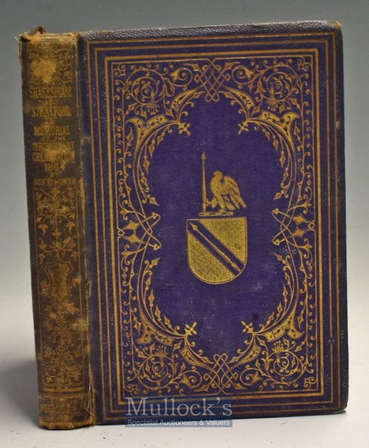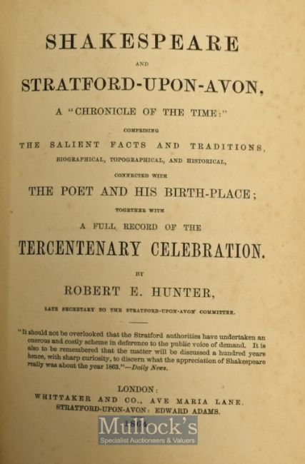 Shakespeare’s Tercentenary - Shakespeare And Stratford-Upon-Avon A ''Chronicle of the Time'' Book First edition^ comprising the Salient Facts and Traditions^ Biographical^ Topographical^ and Historical^ Connected with The Poet and his Birth-place; Together with a full record of the Tercentenary Celebration” by Robert E. Hunter. Published by Whittaker & Co.^ Ave Maria Lane^ Stratford on Avon. 1864 A very good copy of the first edition^ octavo^ viii^ 246pp. Unusual as illustrated with five tipped in Albumen photographs^ six engraved plates and a plan of the pavilion. Most of the text is detailing the Tercentenary Celebrations. Blue pebbled cloth decorated in gilt^ all edges gilt^ size 5” x 7½”. A very good copy of this charming book.