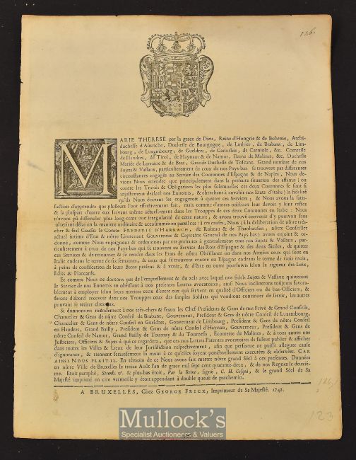 Austria War of The Austrian Succession. Poster of Proclamation By Empress Maria-Theresa Dated 1742 Decree of the Empress in French requiring any of her subjects serving in the Armies of Spain or Naples in Italy to leave those services and enlist in her Armies. Royal Arms of the Holy Roman Empire top centre^ Fine initial letter M with the Empress seated on the Throne. Black letter press printing^ size 12” x 16”.