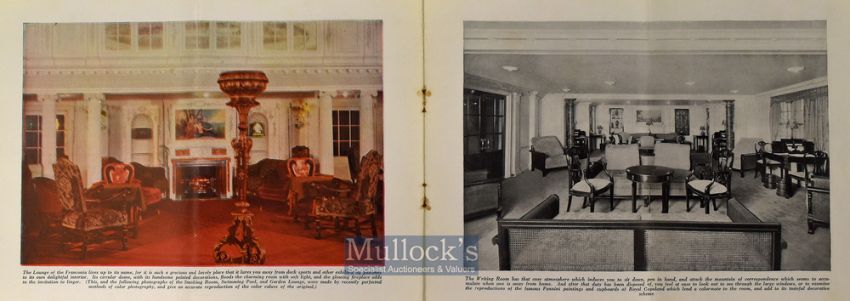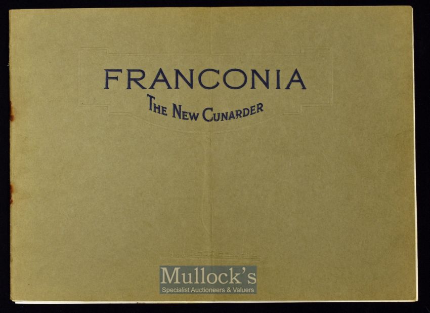 Cunard Liner ‘The New Franconia’ Promotional Brochure 1923 an impressive 16 page publication^ 18 illustrations & photographs of which 5 are in colour and full page size^ of the ship^ her State and public Rooms^ cabins etc. In light grey thick paper covers with embossed titles. Size 10¾” × 7¾” The Franconia was operated by the Cunard Line from 1922 to 1956 served the Liverpool to New York route and later to Canada during Summer Months^ and as Cruise Ship in Winter. Her maiden voyage took place in June 1923.