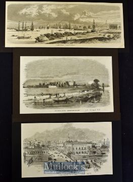 India - Calcutta - Three 19th Century views of Calcutta to include Fort William sketched from the river 1857 25x15cm^ The Harbour 1857 from a French journal 33x13cm and A Street in Calcutta 1859 24x14cm (3)