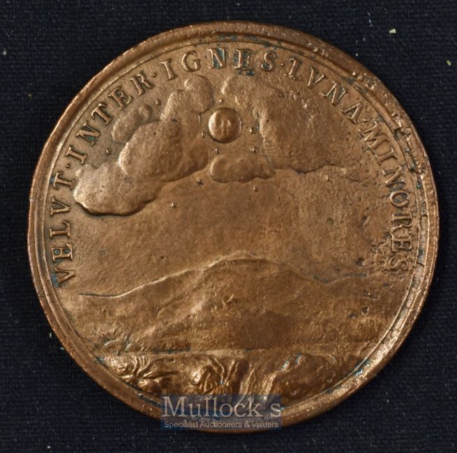 Great Britain – Impressive Queen Mary Memoriam Medallion^ circa 1693 obverse; the Queens portrait. reverse; Moon over Mountain and legend “VELVT INTER IGNES IVNA MINORES” copper size 48mm.