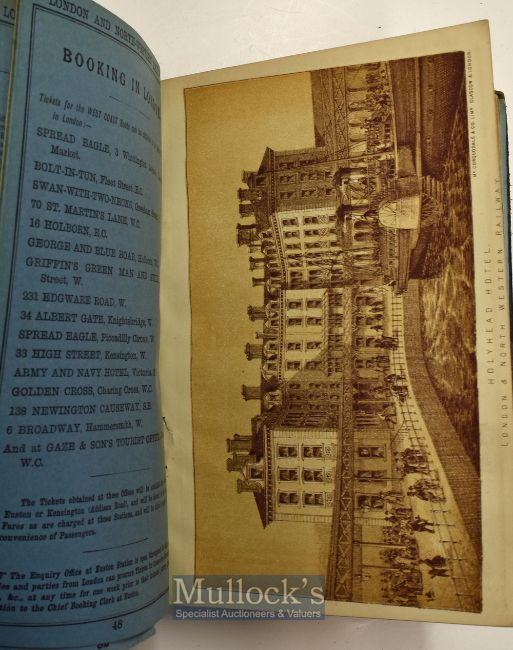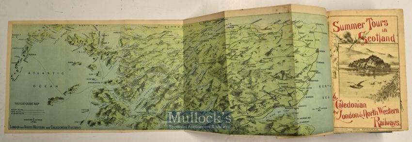 Caledonian & London North-Western Railways Publication - Large Time Table & Excursions Details For Tourists in Scotland 1884 A 777 page publication giving many time tables for their trains also Excursions^ and Circular Tours in the Highlands and Lochs and Canal by Train^ Steamship and Stage Coaches. Has over 30 Plate illustrations^ large fold out map of Scotland printed on both sides. There are also many full page adverts for Hotels most of which are illustrated. In board covers^ size 4¾” x 7¼” and nearly 2” thick.