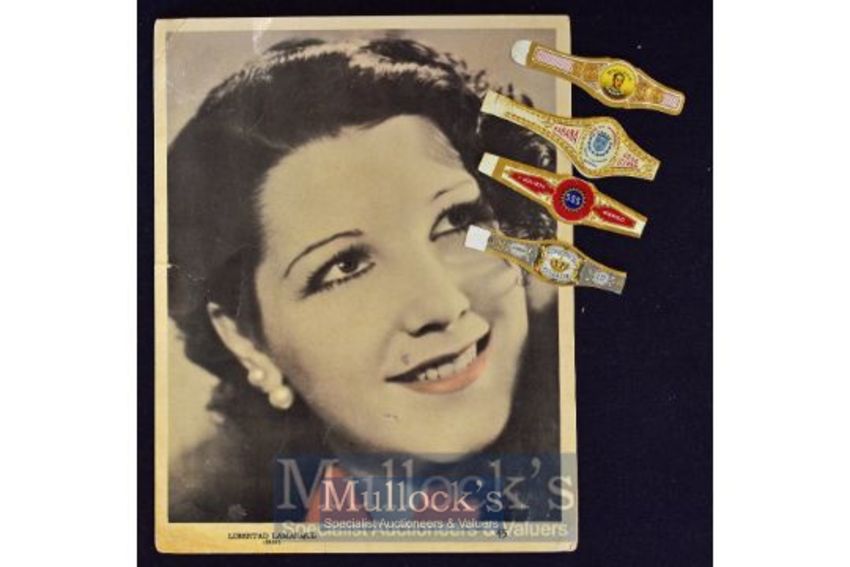 Original 8" x 10" promotional photo of a star "Libertad Lamarque" printed on card stock for "La Corona y Susini" cigars. Small 1" tear to one side +one 2 1/2" tear repaired on back. Presentable and collectable. Also 4 cigar bands for early to mid 20th century cigar brands^ including "Londres Farach" and "Romeo and Julieta".