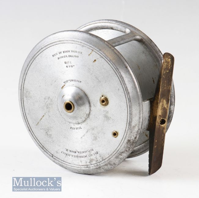 Hardy Bros Alnwick Dup Mk II ‘The Uniqua’ 4 ¼” Spitfire fly reel 1917 check^ ribbed brass foot^ telephone latch^ runs smooth^ retains good finish