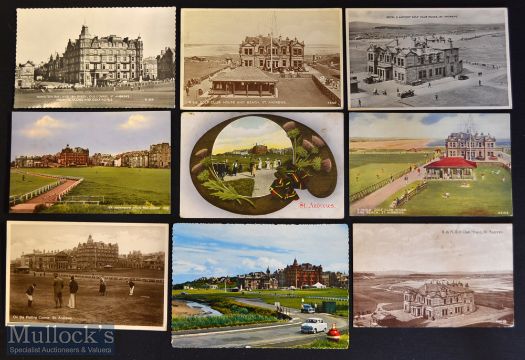 Collection of St Andrews golfing postcards from the Golden Age up to 1960s (9) mostly centred on golfing scenes with R&A Club House taking centre stage – again interesting social scenes^ period cars and blazer wearing golfers - issued by Valentine and Sons^ M and L National Series^ E T W Dennis and Sons^ et al - 3 unused