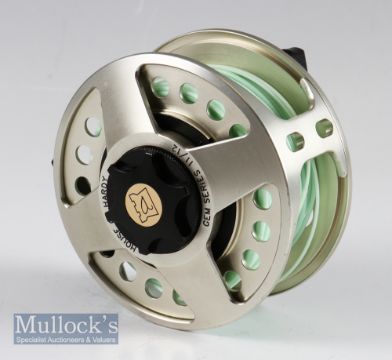 Fine Hardy Gem Series 11/12 salmon fly reel and spare spool 4.1/4” large arbour^ rear drag adjuster^ both with Carron fly lines – 2x small marks to the spare spool rim – otherwise reel appears unused (2)