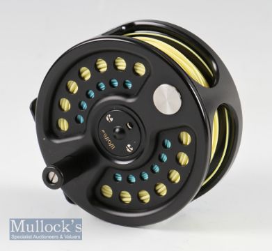Good 4” Hardy ‘The Sovereign’ 9/10/11 Salmon fly reel c/w spare spool black finish^ backplate disc drag adjuster^ fitted with Partridge fly line – in maker’s neoprene reel pouch together with spare spool in makers cloth pokey bag – appear unused