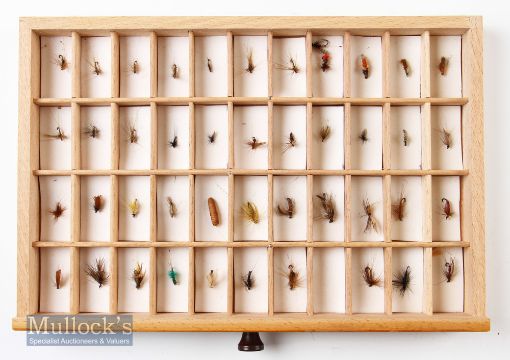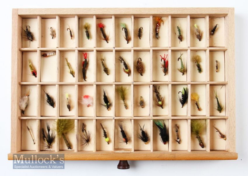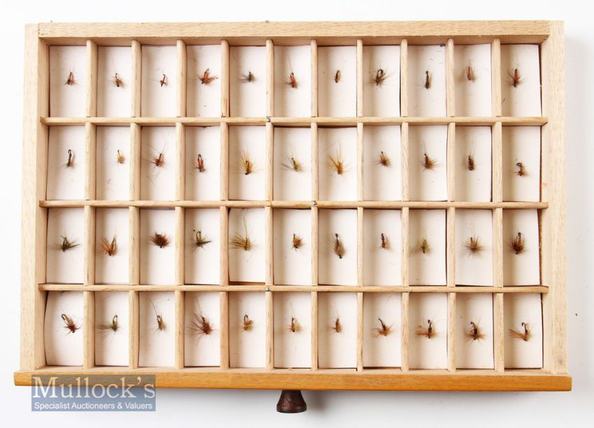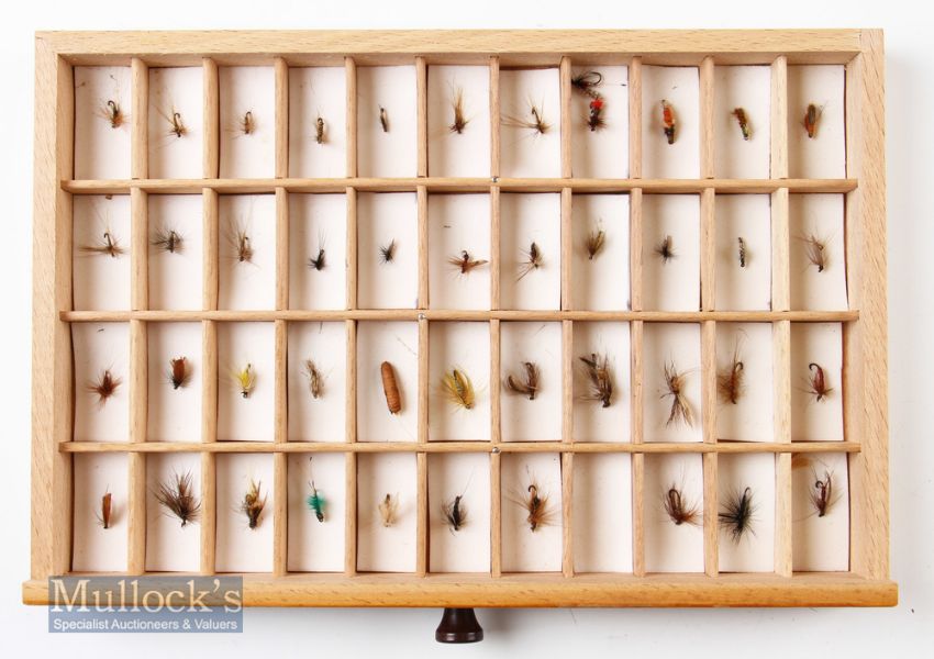 Wooden Fly reservoir containing 300+ assorted dry and wet flies having eight drawers with compartmental sections to each^ measures 12.5x12.25x8” approx.^ appears overall in good condition