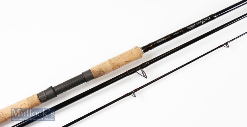 Fine Daiwa “The Wilderness Spinning” carbon rod Model 1103MHS – 11ft 3pc fitted with 3 leg Fuji style guides – casting wt 20-60gms – lightly soiled 25” cork handle fitted with Fuji screw locking reel fittings – hardly used if at all - in mcb and makers gold embroidered Cordura rod tube – an excellent outfit