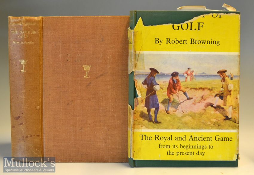2x Golf Books from the1930s/1950s – Robert Browning “A History of Golf – The Royal & Ancient Game” 1st ed 1955 retaining some of the original dust jacket^ c/w numerous colour plates and other illustrations^ internally very clean and sound. Note a comprehensive and well-written history of the game from its origins to the mid-1950s^ often regarded as the first social history of the game – a must for any golf historian; and ‘The Lonsdale Library The Game of Golf’ Vol. IX” 1931 with 100 illustrated photograph plates of leading golfers to incl the Bobby Jones^ Henry Cotton^ Roger Wethered^ Joyce Wethered^ Tommy Armour^ Archie Constant^ Walter Hagan^ Miss Cecil Leitch^ Miss Glenna Collett^ et al bound in sand coloured cloth boards^ 251p^ split to front hinge^ Christmas Greeting to the front free end plate – some minor creases to spine overall (F)