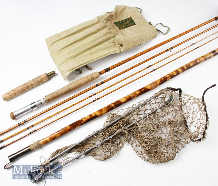 Ogden Smith Rod and Farlow Landing Net (2): Ogden Smiths Ltd London England The Regent 9ft 6in 3pc split cane trout fly rod c/w spare tip and cork butt extension - ser. no 5692- with clear agate lined butt and tip guides – alloy screw locking reel fittings – all original with bronzed guides ( some light speckle rusting) – in mcb: and C Farlow & Co Ltd London alloy and brass collapsible landing net (A/F) fitted with 29” decorative mottled bamboo shaft – leather stretcher broken.
