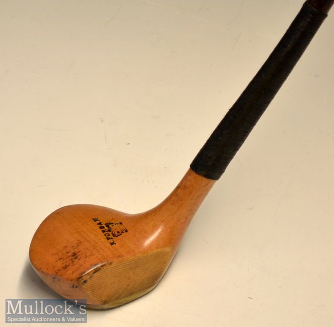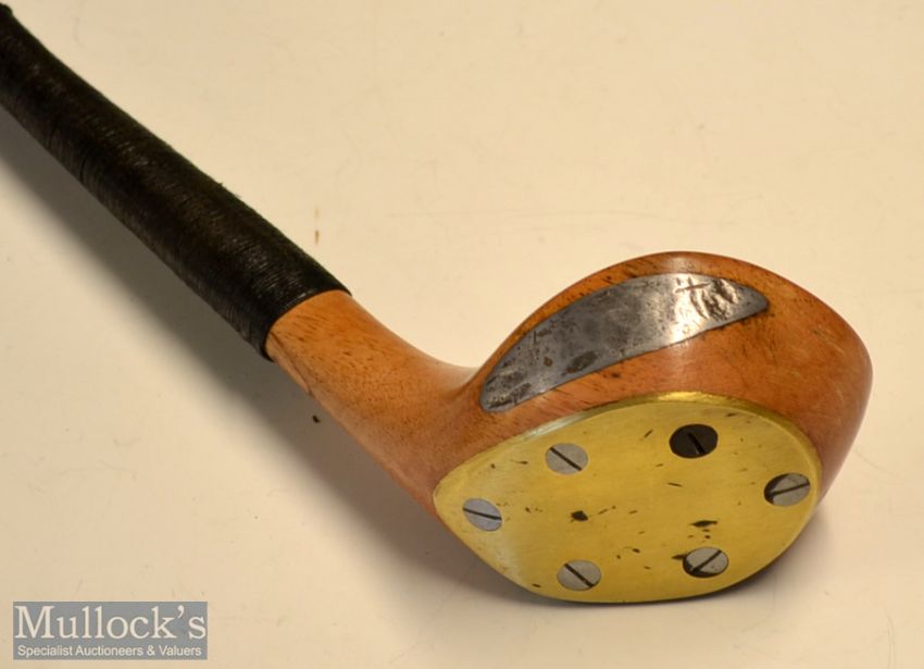 Fine R Forgan Crown golden persimmon scare neck long brassie c1901 – stunning head stamp and full makers shaft stamp below the original thick hide grip with underlisting – quite stunning and appears unused or had very little action – great example.