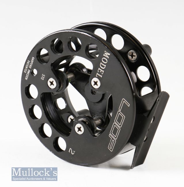 Loop Model 2 3.75” Fly reel with twin tri lobe bearings with front plate adjuster with black anodised finish^ in black padded case^ light overall wear
