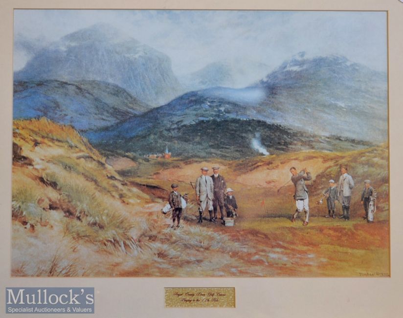 Michael Brown - Life Association of Scotland colour golf print - used for the 1914 calendar titled “Royal County Down Golf Course - Playing to the 11th Hole” showing the Rt. Hon. The Earl Ormealy^ Col Robert H Wallace CBE^ Mr Lionel C Munn and Mr Harold Reader driving from the 11th Tee - mf&g 22.75” x 18”