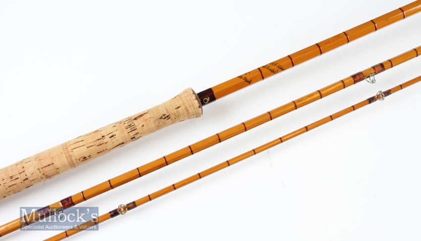 Good Hardy’s England “The No.3 AHE Wood – Steel Centre” salmon fly rod ser. no H33164 (1960) – 12ft 3pc with clear agate lined butt and tip guides – clean 21” trumpet style cork handle with single alloy sliding winch fitting – all original some signs of water stains to the guide whippings – overall good in mcb