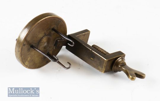 Fine Un-named early 2” brass Gut twister with crank arm^ ivorine handle^ three geared twisting hooks^ with table clamp and original screw^ appears in good working order