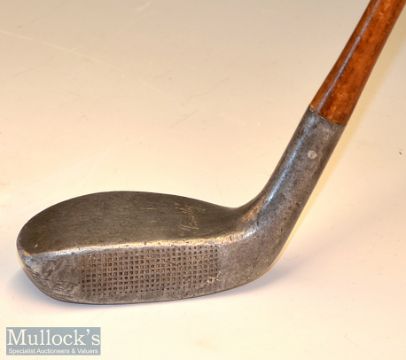 Fine Huntley Pat Thumb grooved handle alloy mallet head putter with rocker sole – stamped with makers Pat details to the top of the thumb grooved handle section – a good example