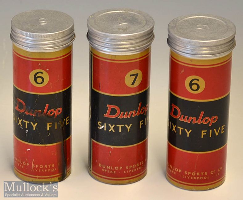 3x Early Dunlop Sixty Five Golf Ball tubular alloy tins – to hold three golf balls with Dunlop Sports Co Liverpool address – each with removable screw on lids – 2x retaining all of the original finish – one with dark brown glue streaks to the rear.