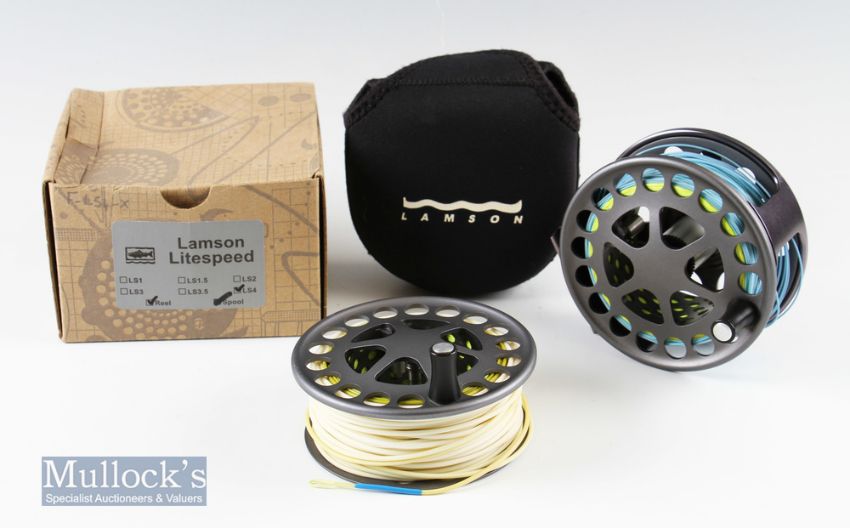 Lamson Litespeed LS4 4 ½” salmon fly reel rear mounted check dial^ in very good condition with spare spool^ maker’s box and neoprene cases – both loaded with line (2)