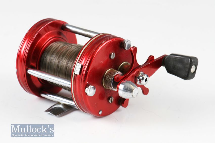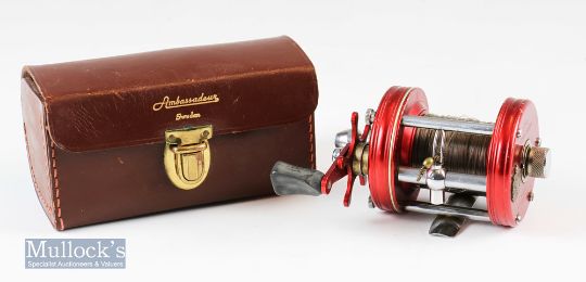 ABU Ambassadeur 6000 multiplying reel in red with maker’s case stamped 009090 to the foot^ counter balance handle^ with bottle of oil and tool^ runs smooth