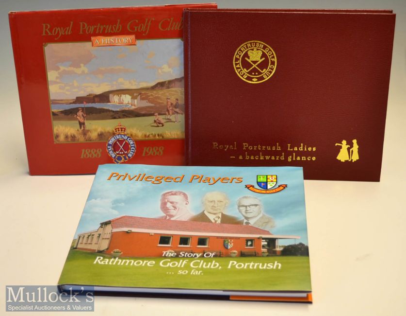 Collection of Portrush Golf Club Centenary/History books – 2x signed (3) “The Royal Portrush Golf Club - A History 1888-1988” signed by the author J.L (Ian) Bamford to the 1st title page with a further dedication “To John (Hanna) a most worthy of golf historian - Best wishes^ Ian Bamford” (G); “Royal Portrush Ladies-a backward glance ”signed by the author Katherine Stewart-Moore to the 1st title page in the original full leather and gilt cloth boards and spine (G); and their illustrious immediate neighbour “The Story of Rathmore Golf Club^ Portrush… So far” 1st ed c2005 c/w the original dust jacket appears unread (G)