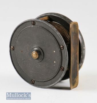 P D Malloch 2 ¾” Sun and Planet brass and alloy reel with five pillars^ 1 ½” crack to backplate^ with line^ smooth brass foot^ runs smooth