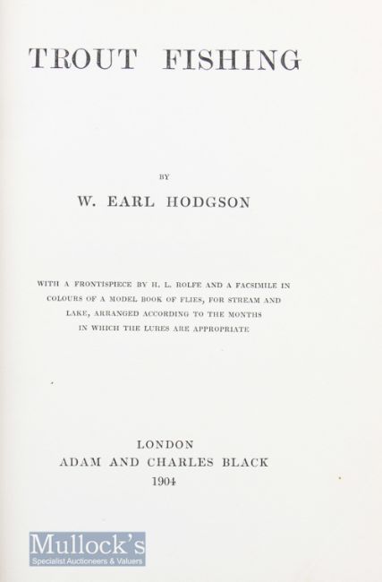 Hodgson^ W Earl – Trout Fishing^ 1904 1st edition having 3 coloured plates of flies^ good condition with original cloth binding.