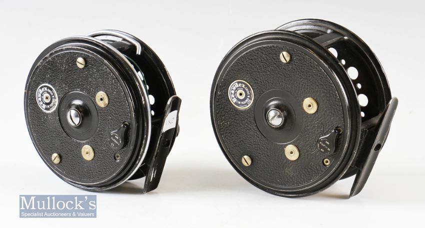 J W Young & Sons 4” and 3 ¾” ‘Beaudex’ fly reels the 4” wide drum 3 ¾” medium width with wire line guide^ hairline crack to centre cap and both in black mottled finish^ runs smooth^ light signs of surface wear (2)