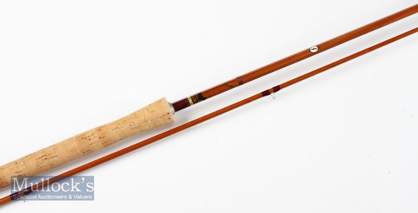 Fine J S Sharpe Ltd Aberdeen “The Scottie” impregnated trout fly rod – 10ft 2pc - line 6/7# - with very clean trumpet style cork handle fitted with makers alloy winch fittings with screw down locking reel fitting – c/w the Farlow oval “F” logo just above the cork handle – very good decal labels - appears unused in mcb – note additional fine clear whipping just below the 2nd line guide^