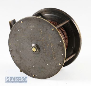 C Farlow 191 Strand London 4” wide drum all brass plate wind reel with four pillar construction^ maker’s inscribed to back plate^ fish logo stamped to bottom of smooth foot