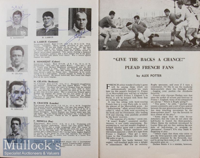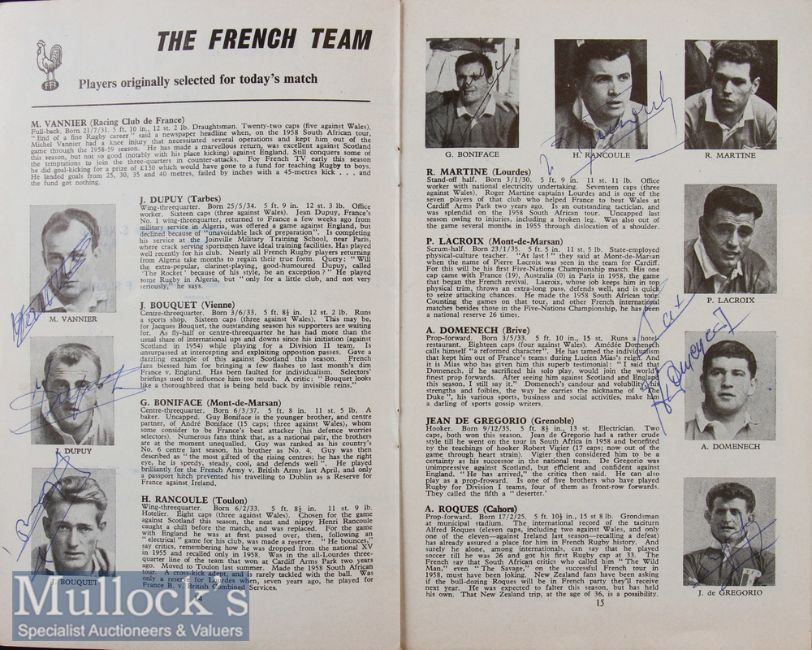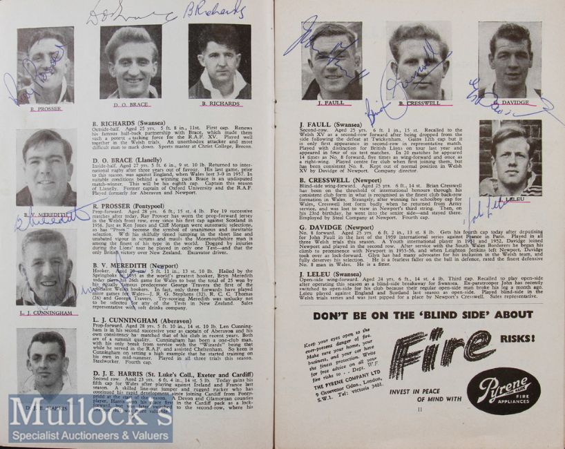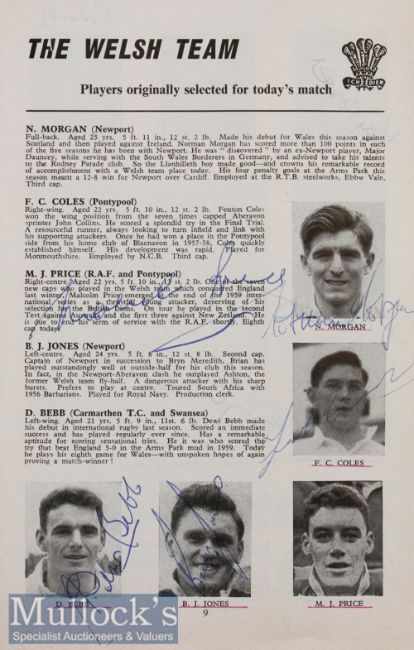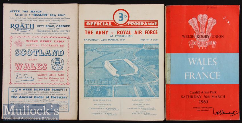 Trio of Wales and Armed Services Rugby Programmes from 1947 onwards - one signed (3): With sellotape neatly to spine^ standard Wales issue for the game v France^ 1960^ nicely & almost fully signed to their pen portraits by both sides^ great names: plus Wales v Scotland at Cardiff^ 1952 and the Army v the RAF at Twickenham^ 1947^ usual 4pp card^ both generally G