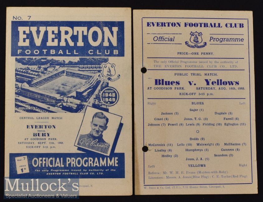 1948/49 Everton Public Trial Match Football Programme Blues v Yellows date 14 Aug^ together with Reserves v Bury date 11 Sept (2)