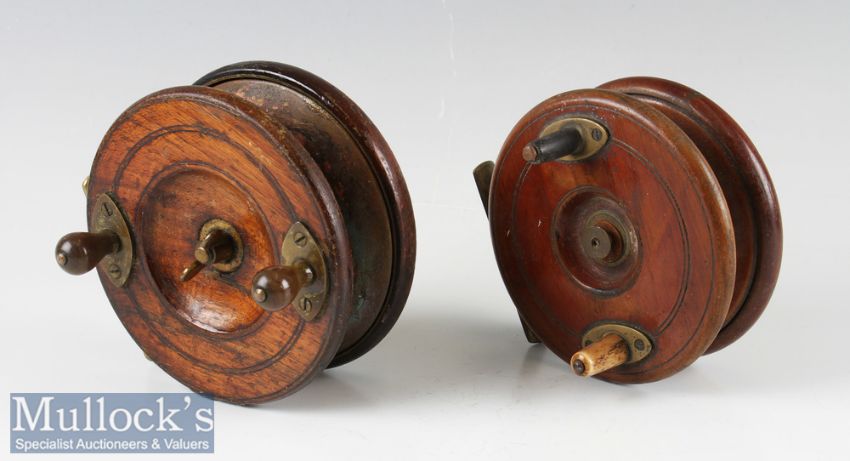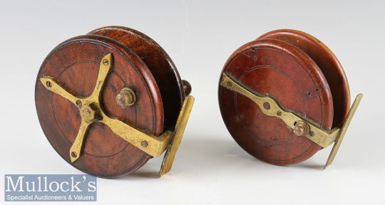 2x Good Nottingham Wooden Brass and Star Trolling Reels - Heatons “Triplelife” Nottingham 5” wooden and brass star back reel – with on/off check button, rear brass drum flange and back plate lining, central wing nut – small kink to brass foot – turns smoothly; and 4.5” Nottingham wooden reel with brass fish tale reel – on/off check – replaced handle – catches slightly – good strong check (2)
