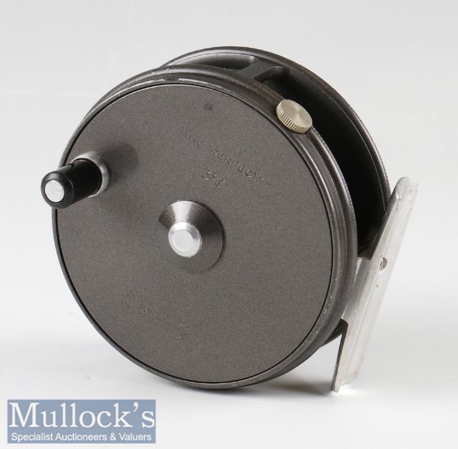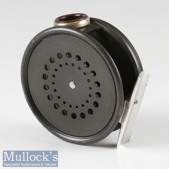 Fine Hardy Bros Made in England The Perfect alloy trout fly reel – 3 3/8” dia with smooth alloy foot, dark brown/red agate line guide – some tiny rim paint wear otherwise retaining nearly all the original dark lead finish – and comes in makers black and gold padded reel case.
