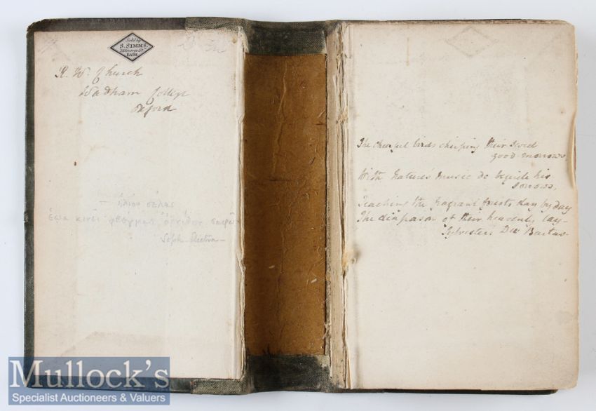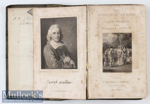 Izaak Walton & Charles Cotton - “The Complete Angler; or The Contemplative Man’s recreation – In two Parts” publ’d 1827 William Pickering - Chancery Lane and printed by Thomas White – small pocket edition – with 2x title pages dated 1827 and 1826 – c/w woodcuts of fish, 1 page of music rebound in green cloth boards – title misprint “Walton and Cooper” – boards loose – period handwritten notes to the front and rear free end plates and boards