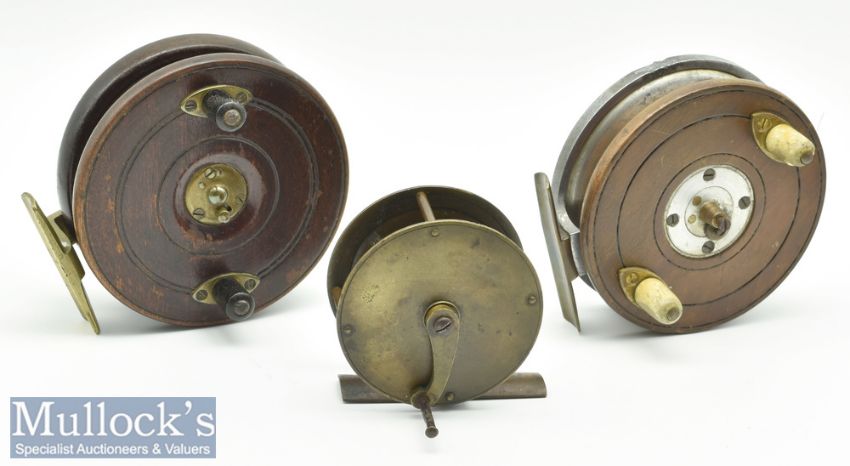 Collection of various Wooden and Alloy combination centre pin reels etce (3) – Slater Style 4” wooden and alloy combination reel with smooth brass foot, rear alloy drum flange and back plate c/w brass on/off check – spring drum release latch – one handle gnawed – spins freely; 4” wooden Nottingham reel with single shaped brass back strap – stamped with the letter “F” to the foot, spring drum release latch – on/off check – spins freely; and 2.75” brass crank wind reel, curved crank arm needs a new handle – 5x metal pins to the foot