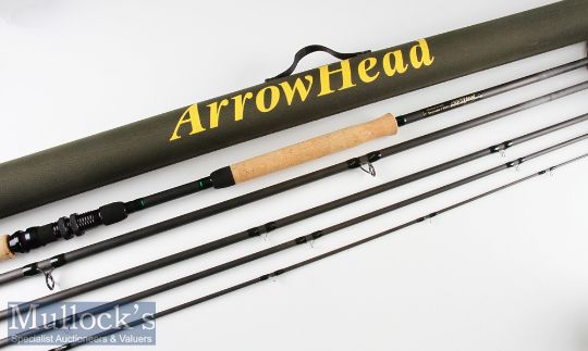 Fine Michael Evans Arrowhead “Speycaster” Carbon Salmon Fly Rod – 15ft 5pc line 9/11# - fuji style line guides to the first section and tip - black anodised screw locking winch fittings with cork top and bottom handles – very lightly soiled otherwise appears unused – comes in fitted black cloth bag and makers “Tek-Neek” green and gold cordura covered rod tube