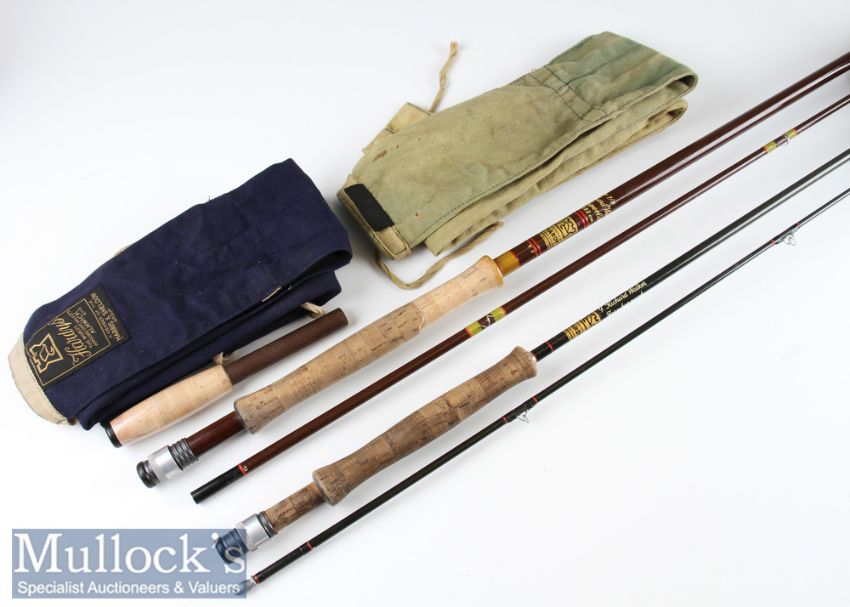2x Hardy Bros “Made in England” fly rods - “Richard Walker Farnborough 9ft 2pc carbon fly rod-line 7/8#, cork handle soiled fitted with single alloy screw locking reel fittings, cork spacer comes in MCB; and “Richard Walker Superlite” 9ft 3in 2pc fibalite fly rod-line 7/8#, cork handle partially soiled (remainder with original cellophane), single alloy screw locking winch fitting with matching Fibalite spacer - comes in original MCB