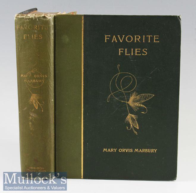 Marbury, Mary Orvis (USA) (1896) “Favorite Flies and Their Histories” 3rd ed publ’d Houghton, Mifflin & Co Boston and New York - The Riverside Press, Cambridge (USA) quarto in the original green and gilt cloth binding with decorative boards and spine - 32 coloured plates of flies - 522 PP good tight copy some slight discolouration to the edges of the pages – some shelf wear to top of the spine – not bad for book which coming up to its 125th anniversary - a cornerstone work for any collection of American angling books.