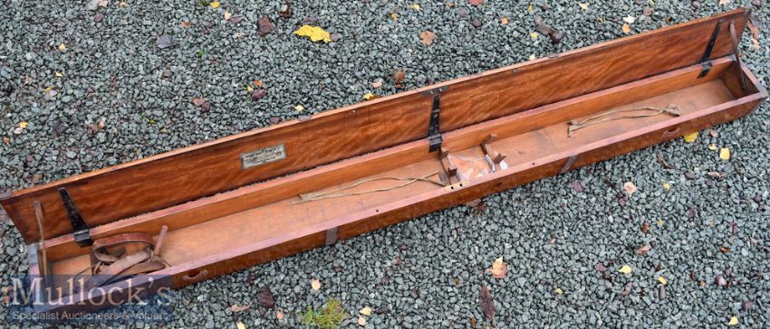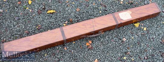 Early Hardy Bros Alnwick Mahogany Travelling Rod Box – fitted with 4x metal outer bands and internal divisions for two rods and comes c/w Hardy’s Makers Metal Label, Hardy’s Mailing Label to the lid and remains of Hardy Compliments label from their London Pall Mall address – comes with it’s key – with previous owners initials J T E neatly etched on to the lid - overall 76”x 6.25” x 5” c/w the original leather handle one end needs stitching easily remedied